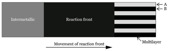 Should the reactants by sufficiently perturbed, e.g., through heat, then they begin to spontaneously intermix on the atomic level, as per Figure 1, where the reaction propagates from left to right, releasing heat in the process [24], and once the reaction is initiated, the subsequent heat release is sufficient such that the reaction continues to self-propagate [20]. Alternate methods for initiating the reaction include the means of using an electric spark or laser pulse [22], whereafter the reaction can also continue to self-propagate.
