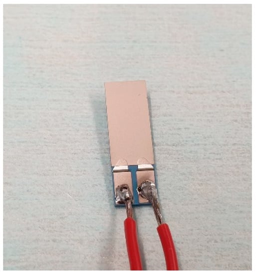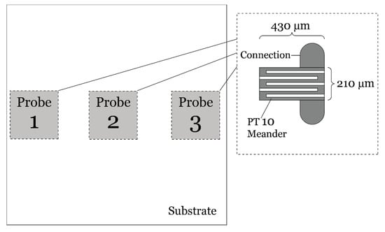 Three temperature probes, P1–P3, approximating Pt-100 temperature sensors with silver vias, were integrated into the model inside the LTCC substrate. In Figure 6, the main dimensions of each probe in the x–z plane and the layer thicknesses are shown.