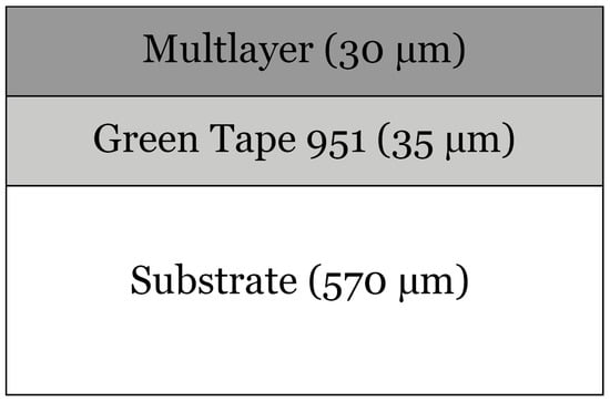 The intention is to deposit the reactive multilayer on a surface that is well-isolated electrically. In order to adapt the nanolayer pile to the rough surface of the LTCC substrate, a dielectric layer is printed on top, as per Figure 2, with a cross section of the reactive multilayer on an LTCC substrate being shown in Figure 3 complete with a GreenTapeTM DuPont (DP) 951 isolation layer. Figure 2 shows the formation required for a so-called tape-on-substrate (TOS) process [26], and furthermore, screen-printed dielectric paste is added to the fired substrate, which then requires a brief drying step and an additional 2 h sintering process.