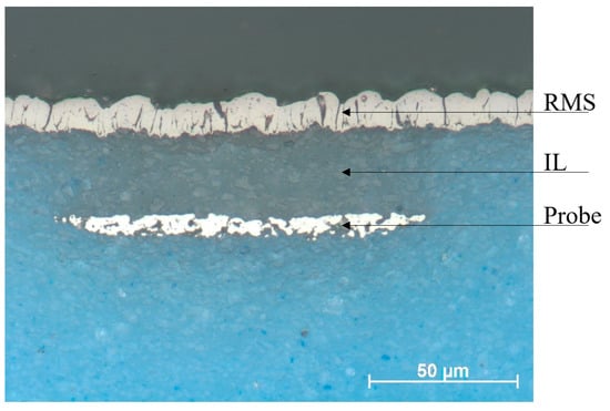 Figure 4 shows a cross-section performed on one of these LTCC substrates with similar embedded temperature probe structures using light microscopy. Here, the reactive multilayer (RMS), the probe and the isolation layer (IL) between the probe and the reactive layer is clearly visible. One can observe from this cross section that each of these structures contains significant roughness, which is not captured in the model where each of the edges are taken to be orthogonal to their respective neighbours and completely straight.