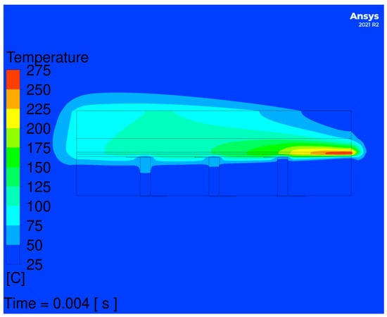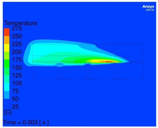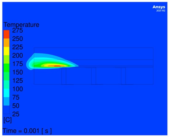 Figure 11 shows the temperature contours at 4 ms, corresponding approximately to the time of reaction exhaustion. By this stage, almost all of the silicon has reached over 100 °C, but the LTCC still has a large percentage of its structure holding on to its initial temperature of 27 °C (300 K).