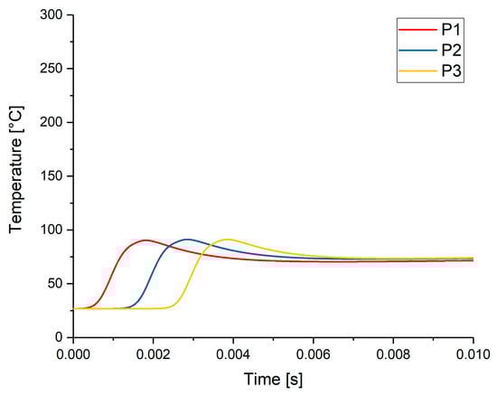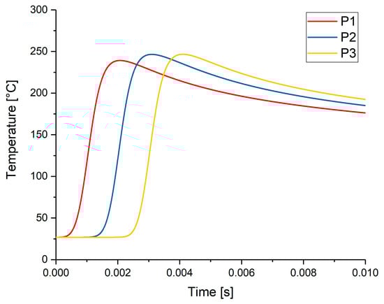 Figure 16 shows the time–temperature history of the three temperature probes embedded in the LTCC, P1–P3. The peaks are similar to those in Figure 13, but the first peak is slightly lower in magnitude than the peaks for the P2 and P3 probes because there is more thermal inertia and less spreading of the heat without the heat sink of the solder.