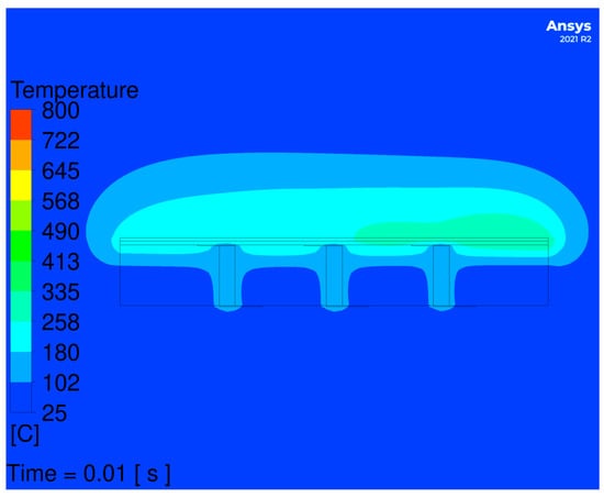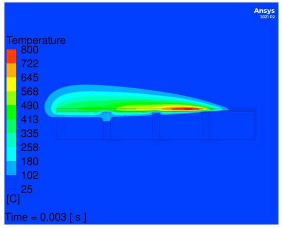 Figure 14 shows the temperature contours for a reactive foil with the exact same heat release UDF equation as in Section 3.1 after 3 ms. The results are qualitatively very similar to that of Figure 9 but the temperatures are significantly higher, owing to the absence of the solder acting as a heat sink for the exothermic heat release. The peak temperatures for this particular heat-release profile reach a temperature of approximately 800 °C.
