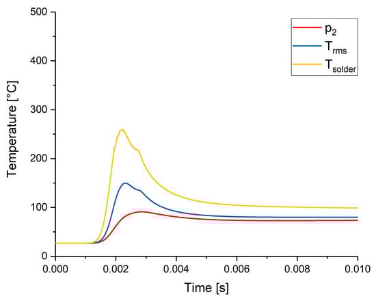 Time–temperature history for three locations, the probe p2, Trms and Tsolder.