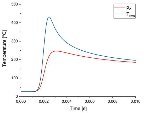 One thing of particular note in Figure 17 is that during cooldown, kinks in the p2 and Trms curves are witnessed, due to the latent heat of the solder between the liquidus and solidus temperatures of 220 and 217 °C, but this information is not sensed by the P2 temperature probe. This could be significant in a real-world scenario because the reaction speed may be affected clearly by the presence of the surrounding solder, but also by the effect of the latent heat.