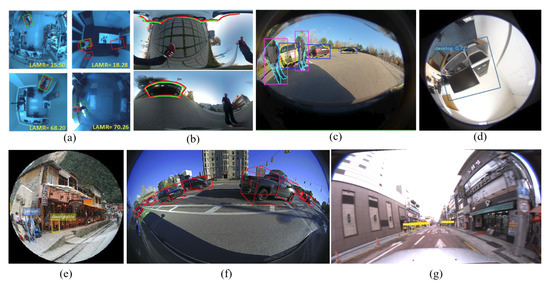 Comparison of the size of bounding boxes: (a) Demirkus et al. [8]; (b) Coors et al. [9]; (c) Arsenali et al. [10]; (d) Chen et al. [11]; (e) Tangwei et al. [12]; (f) Elad et al. [16]; and (g) proposed Fisheye-Dongseongro image.