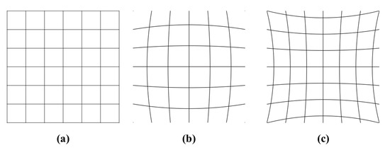 (a) Image without distortion and with two common types of radial distortion: (b) barrel distortion and (c) pincushion distortion.