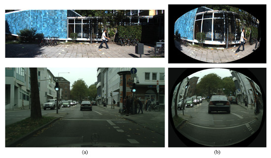 Consequently, several rendering methods have been studied to minimize these distortions. The most representative method is to reproject the fisheye image to the undistorted image by using the principle of fisheye camera models, such as spherical, cylindrical, and rectilinear projection [11,21]. The camera model describes how three-dimensional (3D) world points are projected into two-dimensional (2D) pixel coordinates. Fisheye image correction can be accomplished by the process of mapping the points in the spherical coordinates and to the image coordinates x and y.