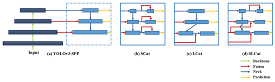 SCat model, illustrated in Figure 8, uses short skip-connections on the neck. We add one concatenation module on the first scale prediction layer, and split five convolutional layers in YOLOv3-SPP into two parts at the second and third prediction layer, then use the skip-connection layer on the neck part of the model. Each concatenated skip-connection is followed by five additional convolution operations to process the features more meaningful to the detection.