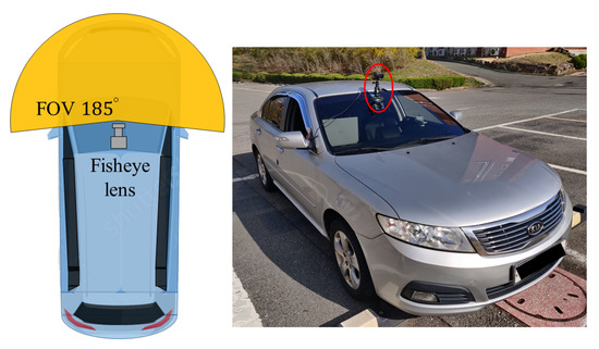 Circular fisheye images from the Fujinon FE185C057HA-1 lens with 1.8 mm focal length and 185° FOV were captured with a FLIR Grasshopper 3 GS3-U3-28S4C-C Camera. Since a front view is the most important vision of the autonomous driving, we installed the camera to the front window of the vehicle as illustrated in Figure 5.