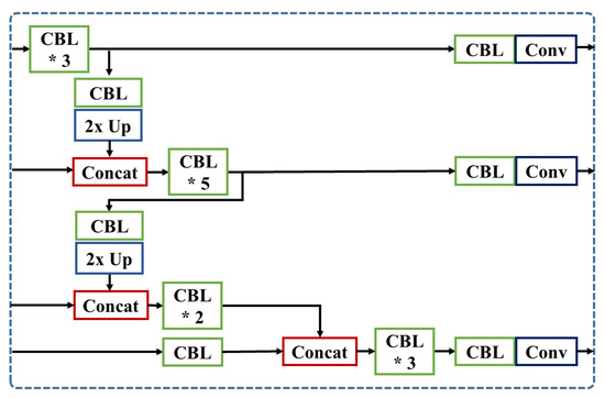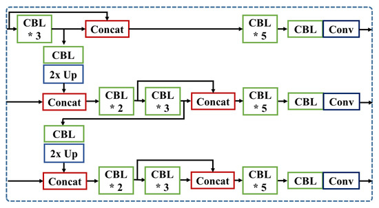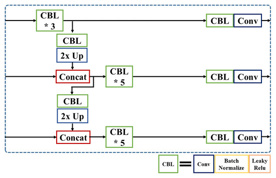 In this section, we propose additional concatenation modules to YOLOv3-SPP model with three variants for extracting more meaningful information about small objects. YOLOv3-SPP is a baseline model and Figure 6 shows the architecture of YOLOv3 network model. In this baseline model, we modified the partial neck of the network to introduce three different feature concatenation methods. Figure 7 shows a detail of the partial neck of YOLOv3. Here, is a combination of convolutional, batch normalization, Leaky ReLu Activation layers and 2× Up indicates up-sampling module. combines the feature map from the backbone layer and the output from 2× Up layer.