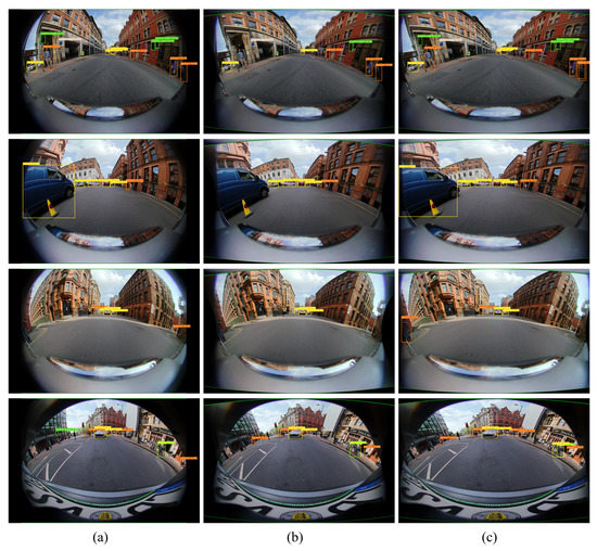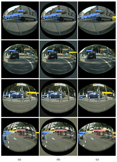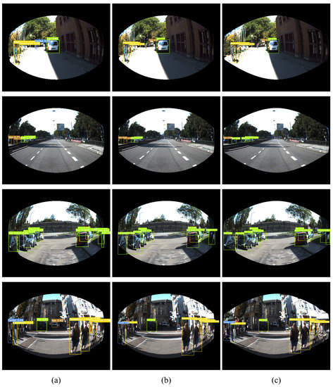 Detection results: (a) Synthetic fisheye image; (b) Spherical-projected image; (c) Expanded-Spherical-Projected image.