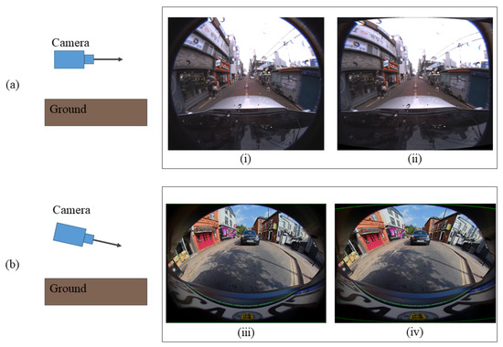 (a) Camera with a principal axis parallel to the ground from Fisheye-Dongseongro. (b) Camera looking downward from WoodScape. (i) and (iii) are the fisheye images and (ii) and (iv) are the spherically projected images.
