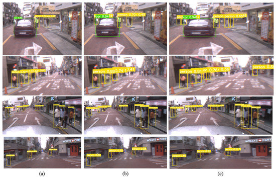 Since the proposed method expands in the overall region of the image, especially the center areas where most of small objects are located, the accuracy result shows 11.4% improvement in compared to the fisheye images, shown in Table 13. Additionally, the expandable projection shows higher detection results in and from most of the models. At YOLOv3-SPP model, our method achieves 2.6% improvement in . The detection results are shown in Figure 15. Since most of the objects are much smaller than the image size, we present cropped example images of the detection result on YOLOv3-SPP from differently projected images.