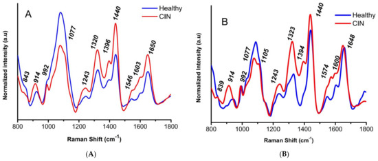 Raman spectra of exfoliated cervical cells from healthy and CIN patients. (A) Average spectrum obtained from the cervical cell cytoplasm of healthy patients (blue line) and that of patients with a cervical lesion, CIN (red line). (B) Average of Raman spectra of the cervical cell nucleus of a healthy patient (blue line) and a patient with lesion, CIN (red line). The most prominent bands are shown for both cytoplasm and nucleus spectra.