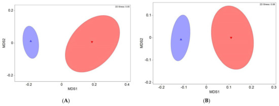 Figure 2 shows two graphs corresponding to MDS and bootstrap averages of the Raman cytoplasm and nucleus spectra of the two groups of patients studied: healthy patients (blue) and patients with a cervical lesion or CIN (red).