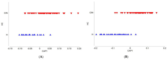 Canonical analysis of principal coordinates (CAP) of biochemical patterns. Samples of healthy patients (H, blue triangles) and CIN patients (CIN, red triangles). (A) Cytoplasmic analysis (δ = 0.567, p = 0.0002) and (B) nuclear analysis (δ = 0.767, p = 0.0001). HC = Health condition. CIN= cervical lesion. Euclidean distance-based analysis.