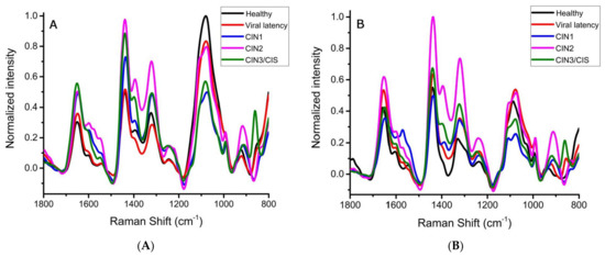 The spectra corresponding to viral latency in Figure 4A,B are very similar to that of healthy samples. The objective of separating the spectra of healthy samples from those of viral latency was to determine if in the viral latency state there would be cellular changes due to the viral action that could be expressed in the Raman spectrum even when no morphological cellular modifications were observed through cytological diagnostic methods. However, even when the virus is present, it does not necessarily cause visible damage to cervical tissue. As we show in these figures, no significant spectral differences were observed when comparing the spectra of samples from healthy patients with those of viral latency (Figure 4A,B).