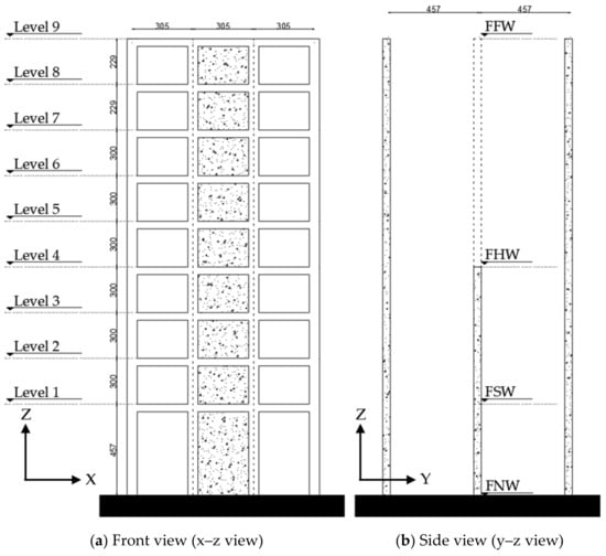 - In order to verify the accuracy of the nonlinear analysis using the STERA_3D (Structural Earthquake Response Analysis 3D) [26] software, four sets of RC frame–wall specimens tested by a shaking table [28] were analyzed, and the nonlinear responses were compared with the test results.