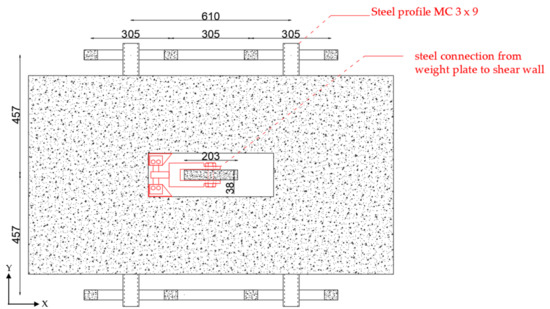 Plan view of the test specimen by Moehle and Sozen; showing connection between RC frames, weighting plates, and RC shear walls (dimension in mm).
