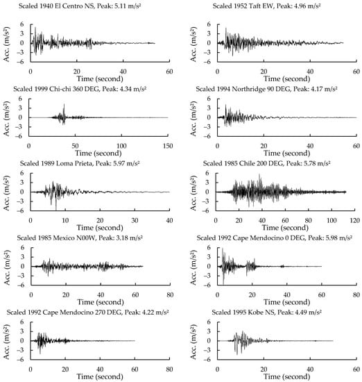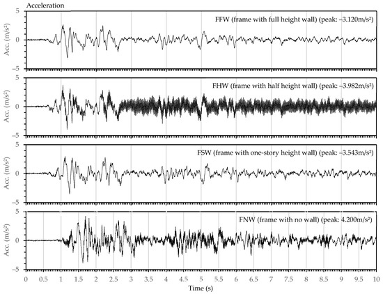 The specimens were tested on the shaking table subjected to the El Centro 1940 Imperial Valley earthquake, and the original time interval was divided by 2.5, considering the scale factor of the specimen. In order to attain a required amount of inelastic response, the peak acceleration was amplified to roughly 0.4 g. The recorded ground motion accelerations at the shaking table are shown in Figure 4 for each specimen.