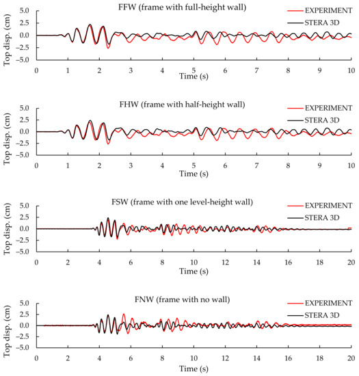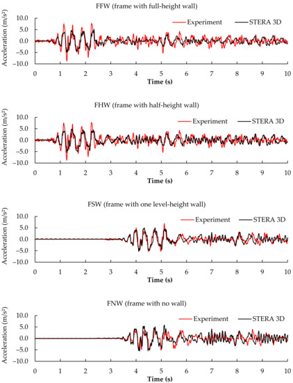 The responses of acceleration and displacement at the top floor were calculated and compared with the experimental data, as shown in Figure 11 and Figure 12. Since the experimental and numerical results only had a slight difference, it is considered adequate to use the STERA_3D for further nonlinear response analyses of buildings with curtailed walls.