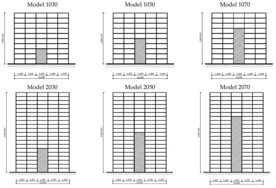 An analytical study was conducted for the reinforced concrete frames of ten and twenty-story with curtailed shear walls. Three different ratios of the curtailed wall heights were selected as 30%, 50%, and 70% of the total height of the structures. Each structure had five bays, and the span length was 6400 mm. The story height was 3000 mm, and the story weight was 3000 kN. In total, there are six types of building models. Each model was then named with the unique code based on its total height and wall percentage coverage: 1030, 1050, 1070, 2030, 2050, and 2070. Figure 13 shows the illustration of the models. Table 1, Table 2 and Table 3 show the detail of building dimensions and the concrete strengths. The tensile strength of main and shear reinforcement rebars for all members are 490 MPa and 295 MPa, respectively. The model was designed to satisfy the criteria of Japanese design standards.