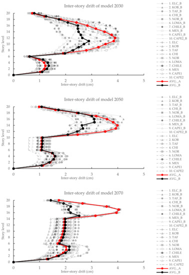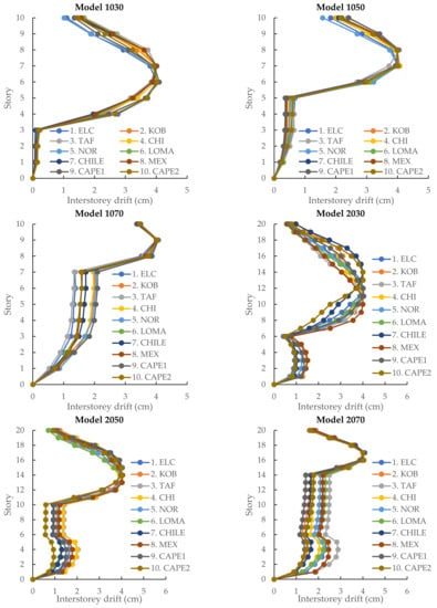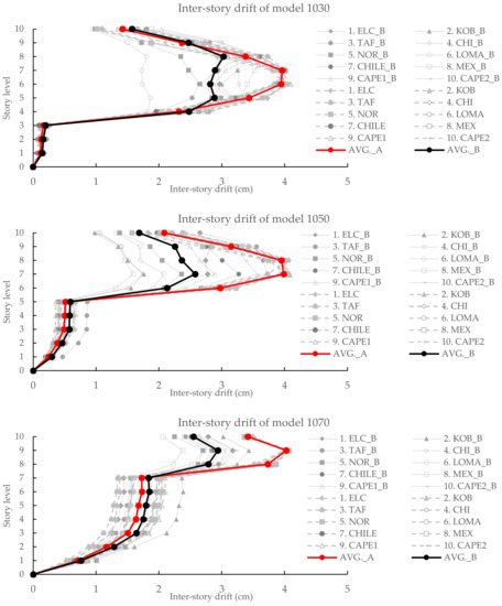 The inter-story drift responses of RC frame-curtailed walls under ten earthquake input motions are depicted in Figure 16. From all nonlinear analyses, it is observed that after the wall coverage is stopped, the drift is then significantly increasing, and it makes a big difference in story drift between the upper part frame without walls and the lower part frame with walls. It is necessary to make all specimens have the same state of inter-story drift before the optimization is performed. Although the location of the peak inter-story drift is different for each earthquake, the scale for input motions in Table 5 is successfully implemented to produce the same maximum inter-story drift of 4 cm, which corresponds to the story drift ratio of 1/75.