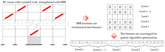 In order to apply the GA in this study, the availability of BRB in the 2D frame structures is indicated using binary, which means the value will be zero if there is no BRB and one if there is a BRB. A set of binary numbers indicate the whole availability of BRB and their locations. These sets are associated with three main parameters to calculate the objective function. Then, six sets are initially generated randomly, and these sets are gathered to be an initial population during the GA process. The process is illustrated in Figure 17.