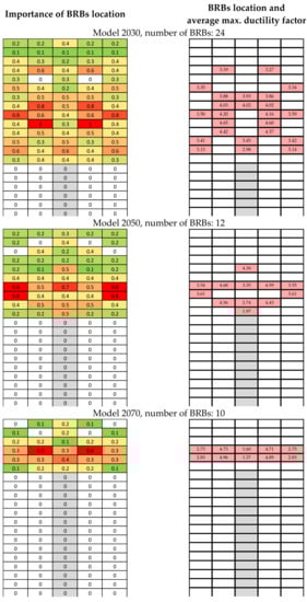 The optimum positions of BRBs under selected ten earthquake ground motions are different for each ground motion. Figure 20 and Figure 21 show the distribution of BRBs location, added with the color, which indicates the probability of occurrence of BRBs location, based on the optimization from 10 different ground motions. The value in the panel is between 0 and 1, where 0 means there are no BRB and 1 means all 10 input motions determine that there is BRB in that panel. The final BRBs locations are then selected ascendingly based on the higher value of possibility.