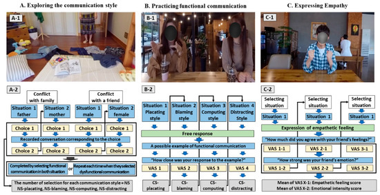 In the task of exploring the communication style, participants experienced dysfunctional communication in two categories of interpersonal conflict situations: conflict with family and conflict with a friend (Figure 1A-1). Participants experienced two situations in each category in the order given: conflict with family: father and mother, conflict with a friend: male and female friends. Participants should select twice one of five response options reflecting the style of communication (placating, blaming, computing, distracting, and functional) in each situation. Specifically, after hearing emotional remarks from a virtual person, participants made the first choice (Choice 1) from five response options that most closely resembled the response they were most likely to actually make. Then, they experienced the recorded conversation consisting of their own reaction and the reaction from the virtual person corresponding to their selection. After experiencing the recorded conversation, participants had to choose the second selection (Choice 2). The next situation with another virtual person (mother or female friend) in the same category was presented and proceeded in the same way. Participants had to repeat the two situations each time they selected a dysfunctional communication style in any situation, and the task was completed by selecting the option of functional communication in both situations in each category. The number of selections for each dysfunctional communication style made before both categories were repeated was recorded and referred to as NS-placating, NS-blaming, NS-computing, and NS-distracting, respectively (Figure 1A-2).