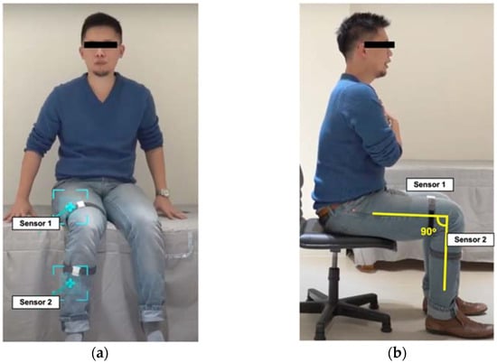 The position of motion sensors worn on the lower limb: (a) sensor position; (b) calibration position.