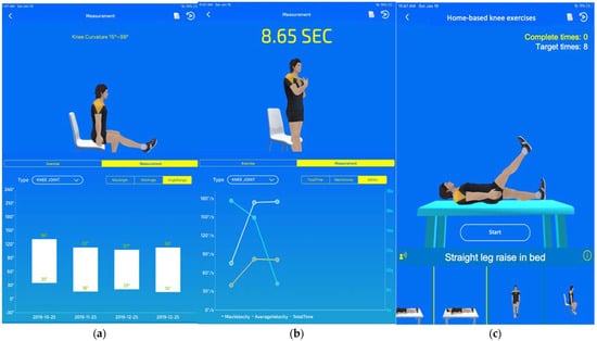 Mobile app for patients: (a) historical records of knee flexion and extension; (b) historical records of 5TSST; (c) daily home-based exercise tasks.