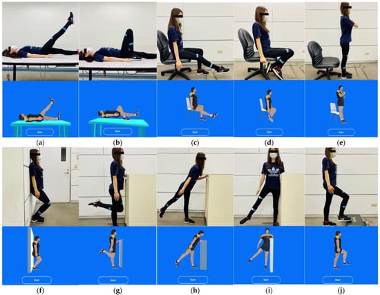 Sets of home-based knee exercises displayed on the mobile app and demonstrated by participants: (a) straight leg raise in bed; (b) knee flexion in bed; (c) sitting knee stretch; (d) sitting knee flexion; (e) sit-to-stand; (f) semi-squat on wall; (g) standing knee flexion; (h) standing hip extension; (i) standing hip abduction; (j) forward step-ups.