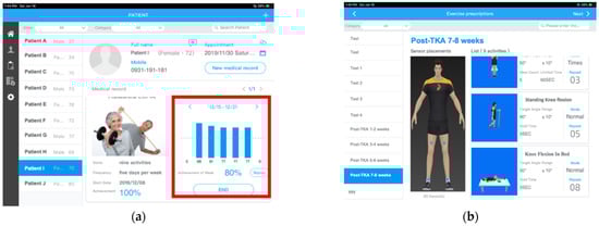 Mobile app for physiotherapists and physicians: (a) the daily and weekly ECR of each patient is displayed with patient information; (b) doctors assign daily exercises with specified targeted angles, holding times, and numbers of repetitions.