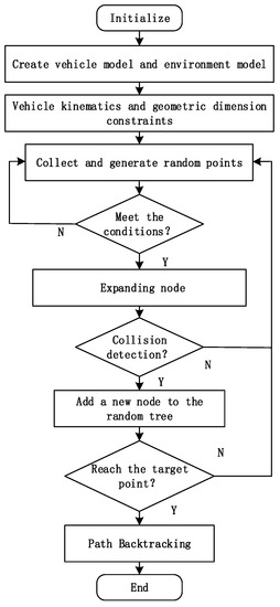 goal. Then, according to the vehicle′s nonholonomic constraints, the sampling of random points is restricted to the feasible region of the forward direction. The feasible region takes the longitudinal axis of the vehicle as the middle line. According to the steering range of the vehicle, a forward sampling range is generated. When the random tree is expanded, the size of the vehicle and the obstacle is considered, and the separation axis theorem is used for collision detection to ensure that the planned path will not collide with the surrounding obstacles. The algorithm flow chart of this paper is shown in