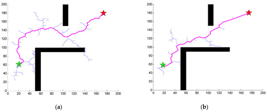Figure 2b, the improved algorithm has fewer sampling nodes and the path distance is short. Therefore, the improved algorithm reduces the path length and the number of sampling points, which improves the efficiency of the algorithm.