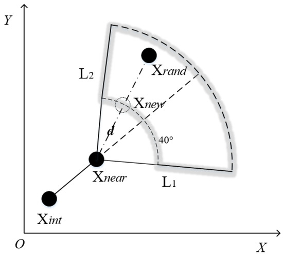 24]. Before the algorithm obtains the path solution, the random tree search is completely random. The random tree often expands to some places far away from the target, and the algorithm efficiency is not high. In order to improve the efficiency of the algorithm, this paper adopts the extended goal bias strategy. By artificially guiding the generation of random points, the target point