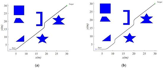 Figure 10b is the simulation image of the improved A* algorithm: blue represents static obstacles of different shapes, and black represents the final trajectory. The initial positions are (2 m, 2 m), and the target positions are (30 m, 30 m). The improved RRT algorithm takes 0.02 s, and the improved A* algorithm takes 0.05 s.
