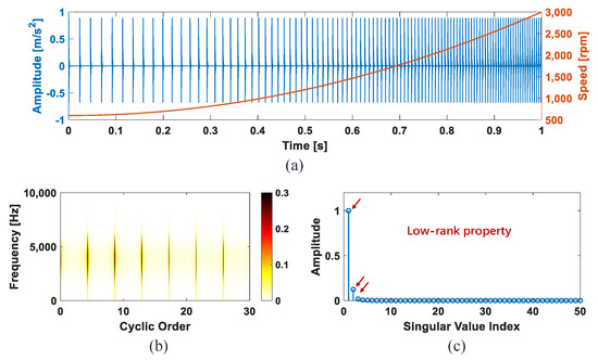 Here, a simulated signal of the outer race fault in a speeding up condition and its OFSC are displayed in Figure 1a,b. The detailed parameters are introduced in Section 4. It can be seen that the intervals between two fault impulses are variable with time. The feature of the fault is sparse in the obtained OFSC. Meanwhile, the singular value decomposition (SVD) is applied on the simulated OFSC, as seen in Figure 1c. It can be seen that the faulty characteristic is relatively large on only several singular values. Hence, the joint sparsity and low-rankness can be used for the extraction of the fault feature.