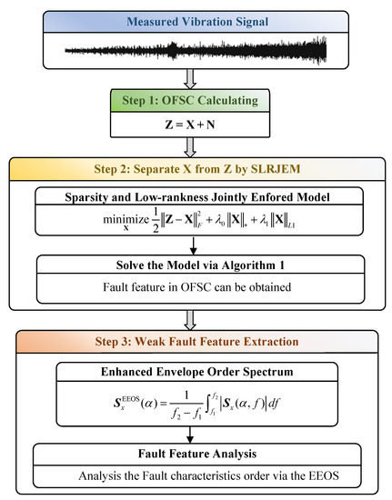 Figure 2 depicts the flowchart based on all of the preceding analyses. The OFSC of the measured vibration signal is firstly calculated. Then, the obtained OFSC is constrained as jointly sparse and low-rank and the derived algorithm is used to detect the time-varying faulty characteristic. Finally, the EEOS is computed to further enhance the fault feature in OFSC and the fault characteristic order can be further analyzed. The detailed process is: