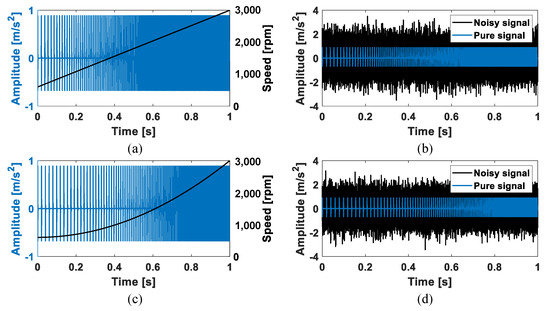 Two rotation speeds with linear function () and quadratic function () are used with the ball-pass-order on the outer race (BPOO) of fault feature cyclic orders and respectively are studied in this case. Other parameters are arranged as follows: the sampling frequency 51,200 Hz, the sampling length 51,200 (a signal with one second), the resonance frequency Hz and coefficient of resonance damping attenuation . The intervals between two transient impulses are decreasing with the increasing speed, which can be founded in Figure 3a,c. The Gaussian white noise (SNR = −16 dB) is added in simulated signals, which can be seen that the fault transient impulses are covered by the strong background noise (seen in Figure 3b,d).