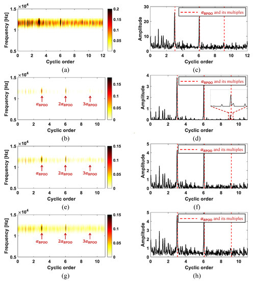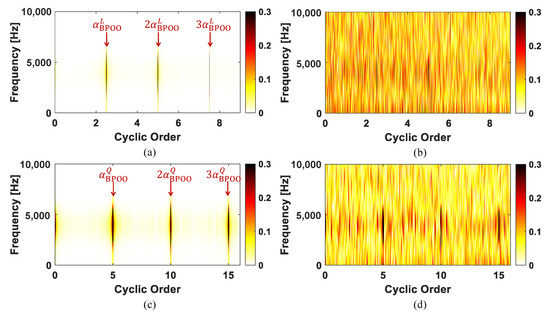 Then, OFSC is computed to transfer the time-domain signal into the cyclic order-frequency domain. The time costs of the three methods are listed in Table 1, which can be seen that the computation burdens are similar. The OFSCs of the two simulated signals are shown in Figure 4. The fault cyclic orders (fault feature) can be found in the OFSCs of the pure transient impulses clearly. However, the strong background noise almost completely covers the fault feature as shown in Figure 4b,d. Then, the EEOSs of the two noisy OFSCs are tried to enhance the fault feature. Figure 5 shows that the fault cyclic orders are more pronounced compared with that in OFSCs, especially at the condition of . The first order component at the condition of is obvious. However, its multipliers are still covered by the strong background noise, which needs to be effectively extracted.