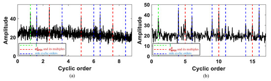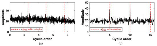 To make the fault cyclic order more clear, the EEOSs of the denoised OFSCs obtained by the proposed method are demonstrated in Figure 6b and Figure 7b. It can be seen that the noise near the fault cyclic order is significantly suppressed, which makes the fault feature more obvious. In the EEOSs obtained by the other two methods, the unseparated noise components in OFSC interfere the clear identification of s, especially in Figure 6f and Figure 7d.