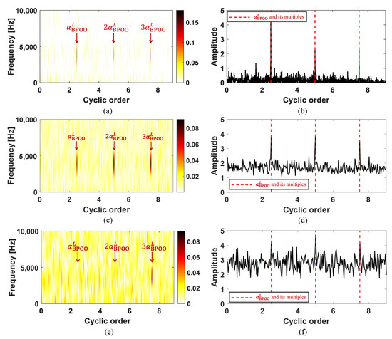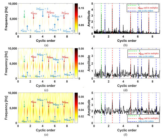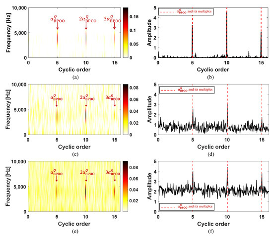The results after operating the three methods are shown in Figure 11 and Figure 12. At the quadratically changing speed condition (), the proposed algorithm can effectively extract the fault feature (seen in Figure 12a, and the corresponding EEOS in Figure 12b shows it more clear. At the linearly changing speed condition (), the fault cyclic orders and their multipliers are effectively extracted. In comparison, the side cyclic orders are not obvious in Figure 11a. This may be due to the relatively lower amplitude on the side cyclic orders. From the EEOS of the denoised OFSC with linearly changing speed (seen in Figure 11b), the amplitude on the BPOI and its sides are larger than the components around them, which is more obvious. Compared with the other two methods, the noise components in OFSCs are not greatly eliminated due to the inadequate constraints, which make the time-varying fault features not clear enough to identify. Even according to EEOSs, the noise components interference the accurate judgment of the fault feature, especially in Figure 11d and Figure 12f.