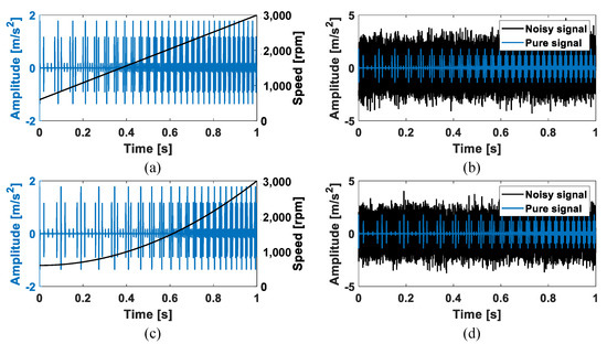 The simulated signals in Case 2. (a) the transient impulses and rotation speed with linear function (line in blue: the signal waveform adhering the left y-axis and line in black: the shaft rotating speed adhering the right y-axis); (b) the noisy signal with linear function; (c) the transient impulses and rotation speed with quadratic function (line in blue: the signal waveform adhering the left y-axis and line in black: the shaft rotating speed adhering the right y-axis); (d) the noisy signal with quadratic function.