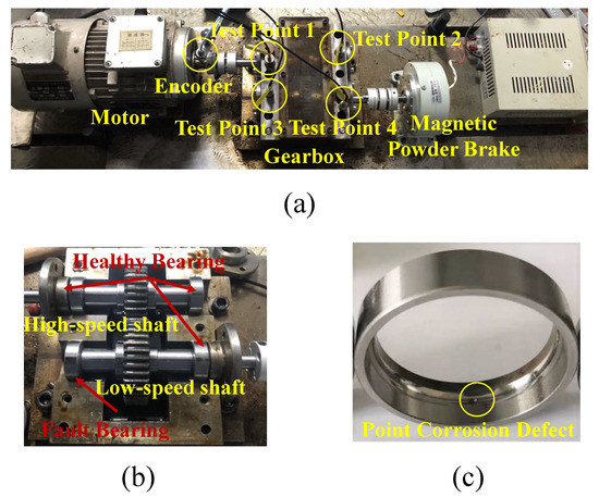 The layout of the experiment. (a) the experiment rig; (b) two shafts in the gearbox; (c) the point corrosion defect on the outer race.