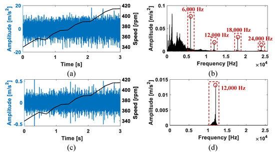 The time domain waveform and spectrum of the measured signal before and after band-pass filtering. (a) the time domain waveform and rotating speed before band-pass filtering (line in blue: the signal waveform adhering the left y-axis and line in black: the shaft rotating speed adhering the right y-axis); (b) the spectrum before band-pass filtering; (c) the time domain waveform and rotating speed after band-pass filtering (line in blue: the signal waveform adhering the left y-axis and line in black: the shaft rotating speed adhering the right y-axis); (d) the spectrum after band-pass filtering.