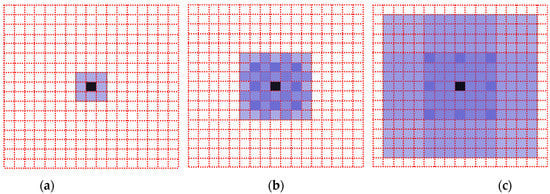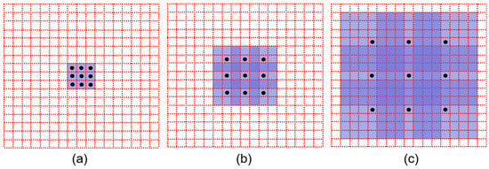 The dilated convolution with dilation rate of 1, 2 and 3, respectively. (a) dilation rate = 1; (b) dilation rate = 2; (c) dilation rate = 3.