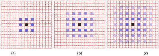 The dilated convolution with the same dilation rate of 2, respectively. There are grid effects in all three graphs. (a) the first convolution with dilation rate of 2; (b) the second convolution with dilation rate of 2; (c) the third convolution with dilation rate of 2.